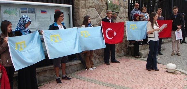 Учасники акції вийшли з турецькими і кримськотатарськими національними прапорами і висловили свій протест проти політики РФ - залякування кримськотатарського народу.