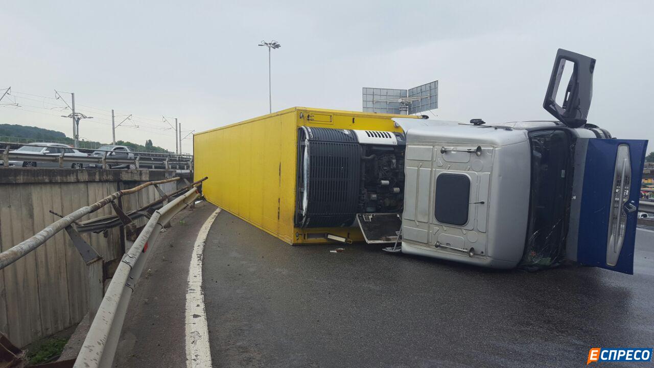 На з'їзді з Південного мосту в напрямку Столичного шосе перекинулася фура.